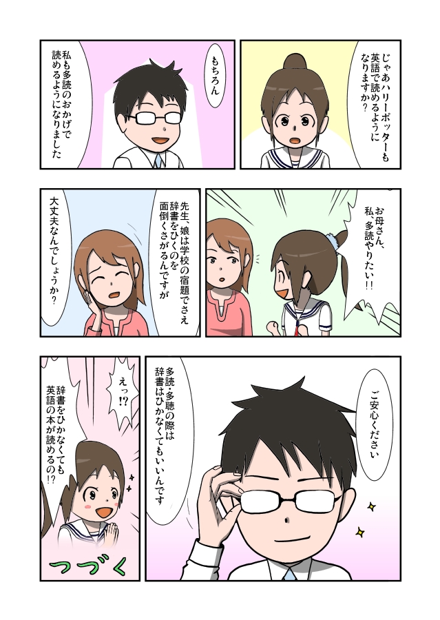 第2話『英語の多読・多聴の進め方』へ 目次へ 多読・多聴についてもっと詳しく知りたい方はこちらへ。
